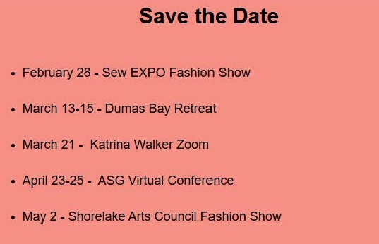 Click the “JOIN ASG” button to join American Sewing Guild. When registering with ASG, choose “WA/Seattle” as your Affiliate Chapter. If you would like to check us out first, you may attend 2 meetings as our guest before joining. We look forward to seeing you!