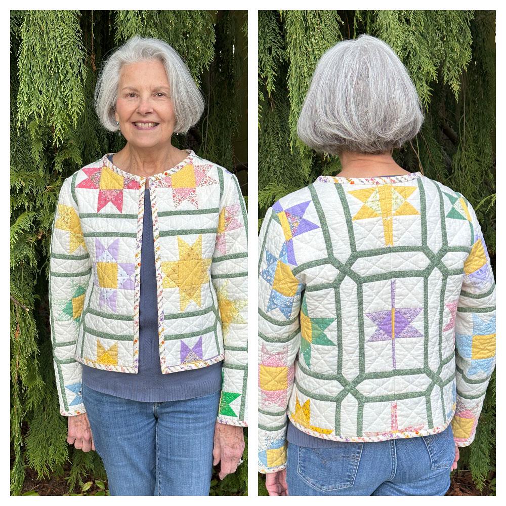 Pattern from Built by Wendy, the Column Coat. Thanks Day Seamers for the fitting help. The quilt was not that big and as a result it took nearly 2 hours to figure out the best way lay out the pattern pieces. Then….I had to cut into the quilt. Must admit I felt guilty doing that. All the seams were finished with a Hong Kong finish using some ice dyed fabric from a summer’s project. Found the perfect small cotton print for the binding on all the jacket edges and sleeves. Love the fit and the fact that all the pieces were in my stash.